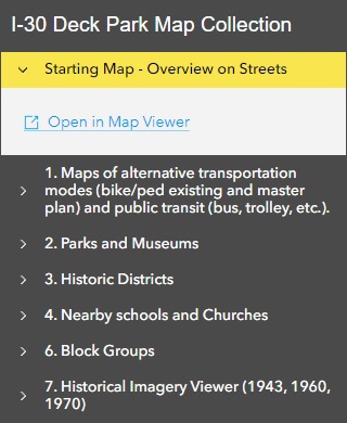 Click on the map button below to access the interactive maps. The link will open up to the Starting Map - Overview on Streets (shown highlighted in yellow in the example image). Seven additional maps are listed in the menu.